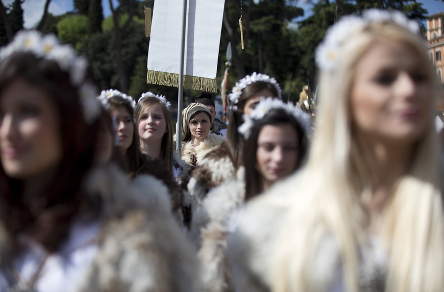 Read moreGroups of people costumed as ancient Romans parade near the Colosseum, Circus Maximus and Roman Forum to celebrate the festivities of Christmas of Rome, in Rome, Italy, on April 21, 2013. Legend says that Rome was founded by Romulus in 753 BC in an area surrounded by seven hills. Every year the city celebrates the Birth of Rome with parades and fighting in costume, reenacting the deeds of the great ancient Roman Empire. #