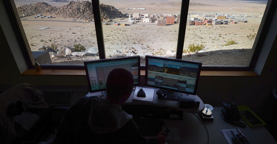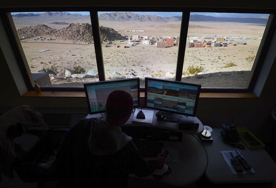 Read moreA computer operator watches screens displaying live interior and exterior images of the mock village before him during a training exercise at the National Training Center at Fort Irwin, California, on February 20, 2013. #