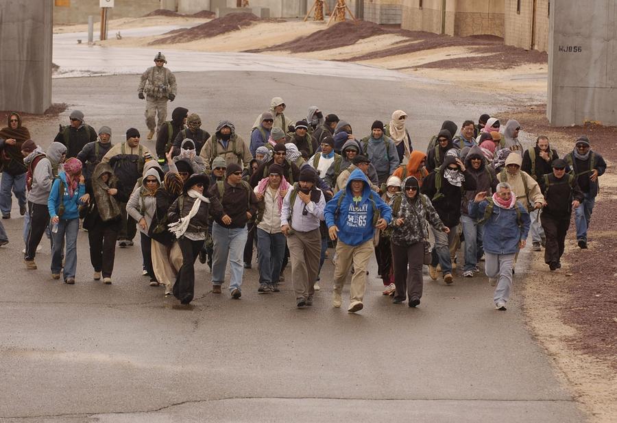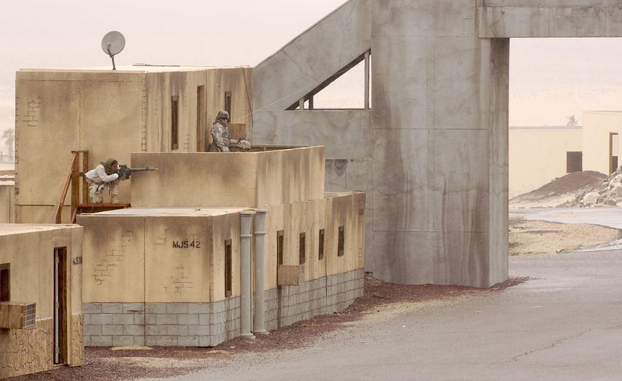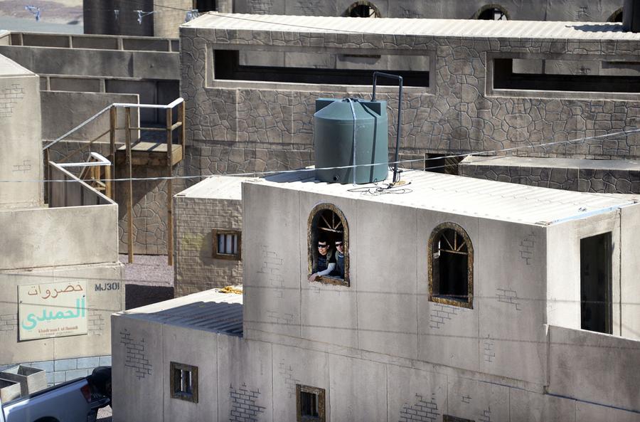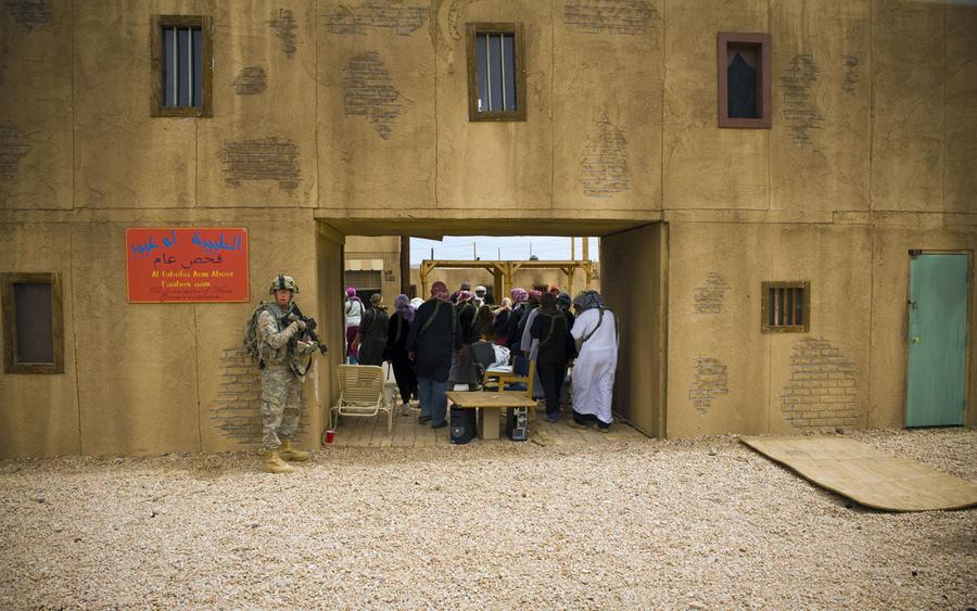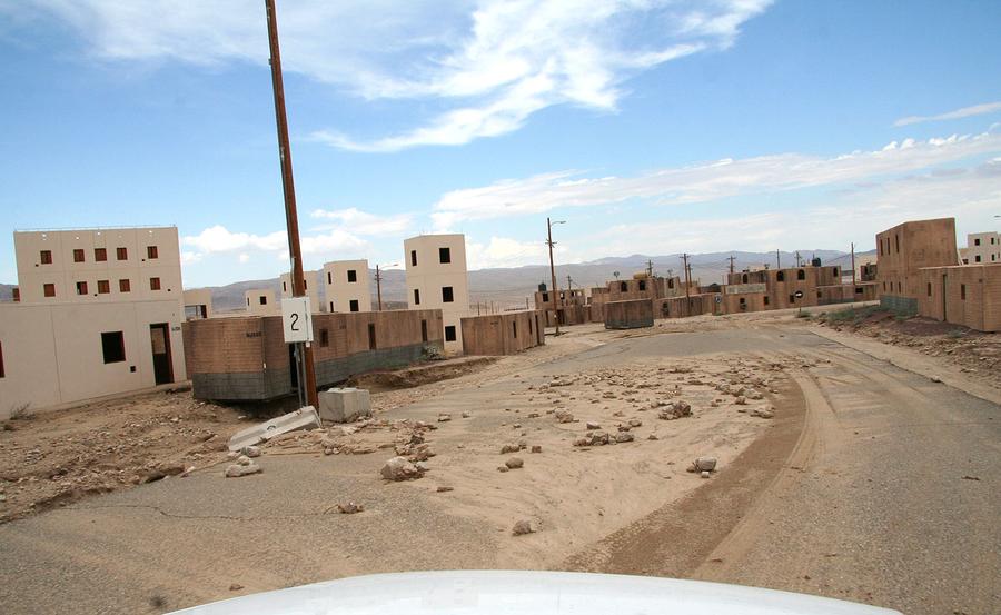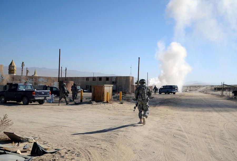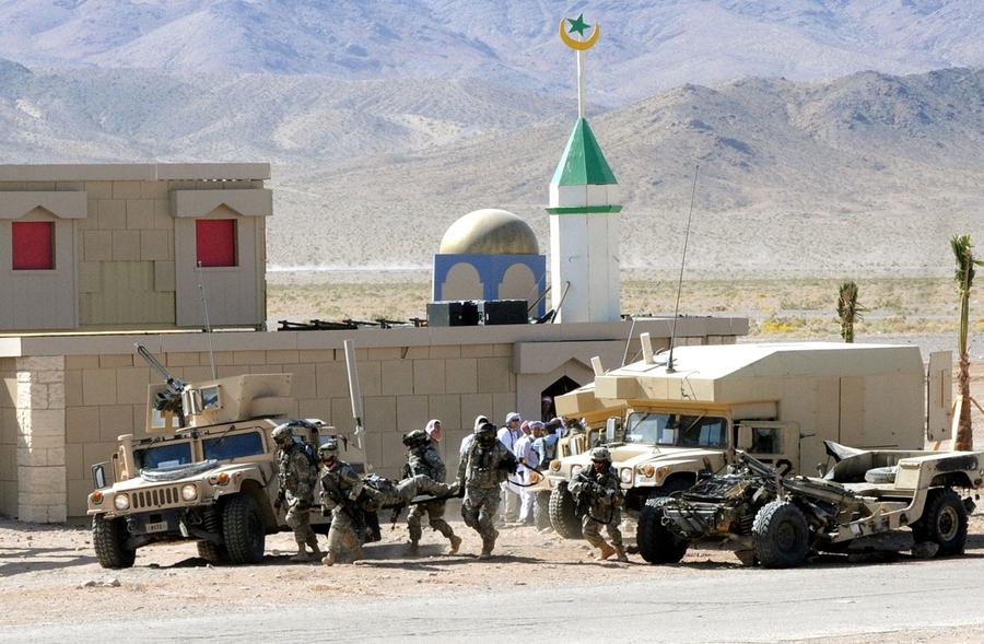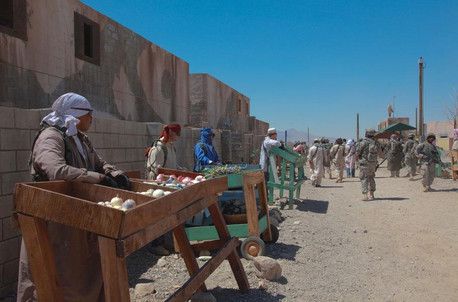 Afghanistan can be found just 120 miles northeast of Los Angeles, California -- well, an approximation of Afghanistan at least. In the Mojave Desert, the U.S. Army's National Training Center at Fort Irwin is home to several mock villages built to create realistic training environments for troops due to be deployed overseas. Two of the largest "villages" have been used to represent several fictional towns in Iraq and Afghanistan, with names such as Medina Wasl, Ertebat Shar, Razish, and Medina Jabal. Units undergo training scenarios, exposing them to a realistic version of their "worst day ever," surrounded by military and civilian actors portraying Afghan locals, police, and insurgents. Simulations include the detonation of IEDs, rocket attacks, suicide bombings, as well as practice with crowd control, interaction with locals, and providing aid. The mock combat includes exposure to realistic horrific injuries, with real-life amputees portraying victims who have had limbs blown off, complete with gory prosthetics and fake blood. The photos here show a few of these villages during several different training missions over the past few years.