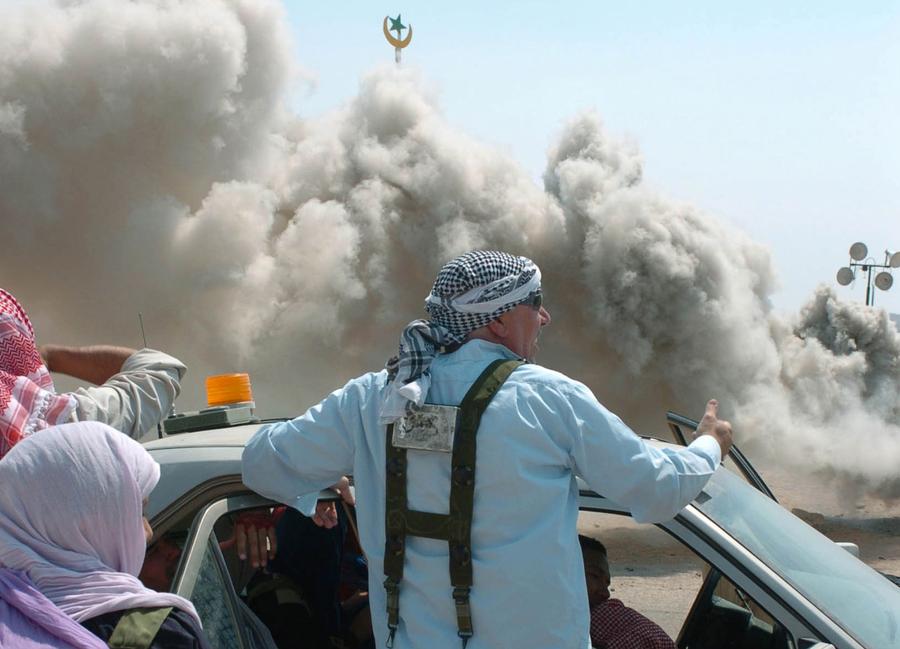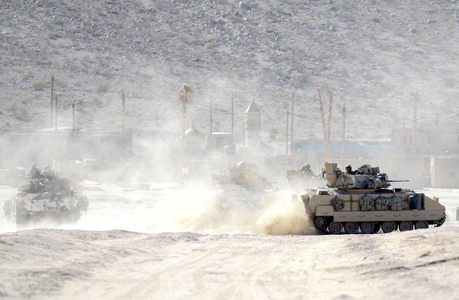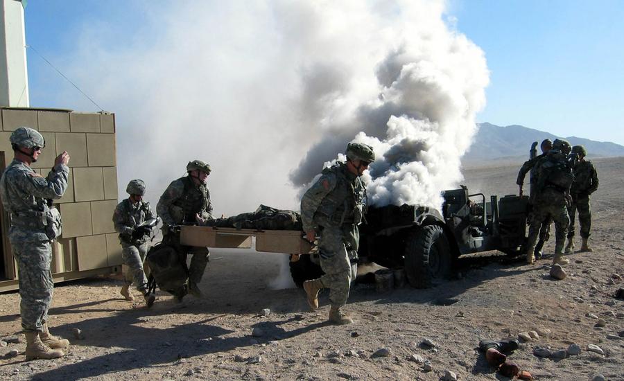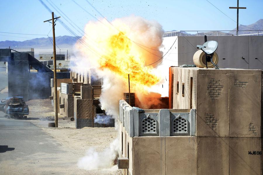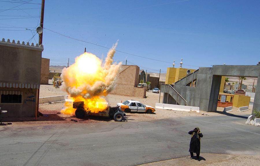 Read moreA simulated improvised explosive device (IED) explodes during a mass-trauma training exercise at Medina Wasl, a training village at the National Training Center on Fort Irwin. #