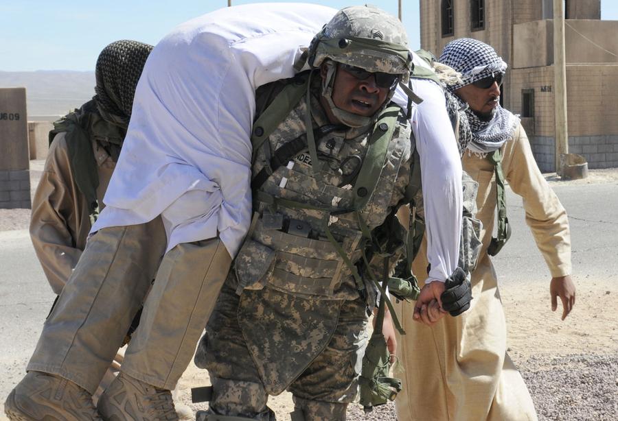Read moreA soldier from the 4th Special Troops Battalion, 4th Brigade, 1st Armored Division, carriers a civilian role-player during a situational training exercise at the National Training Center. #