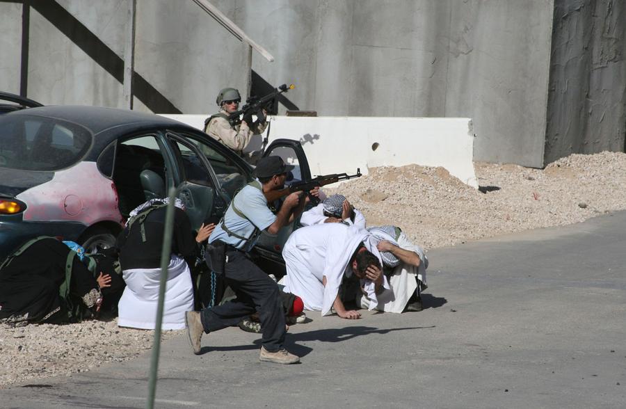 Read moreAn Iraqi policeman role-player protects civilians from mock insurgent attacks, on January 20, 2009, at Medina Wasl, an urban training site at the Army's National Training Center. #