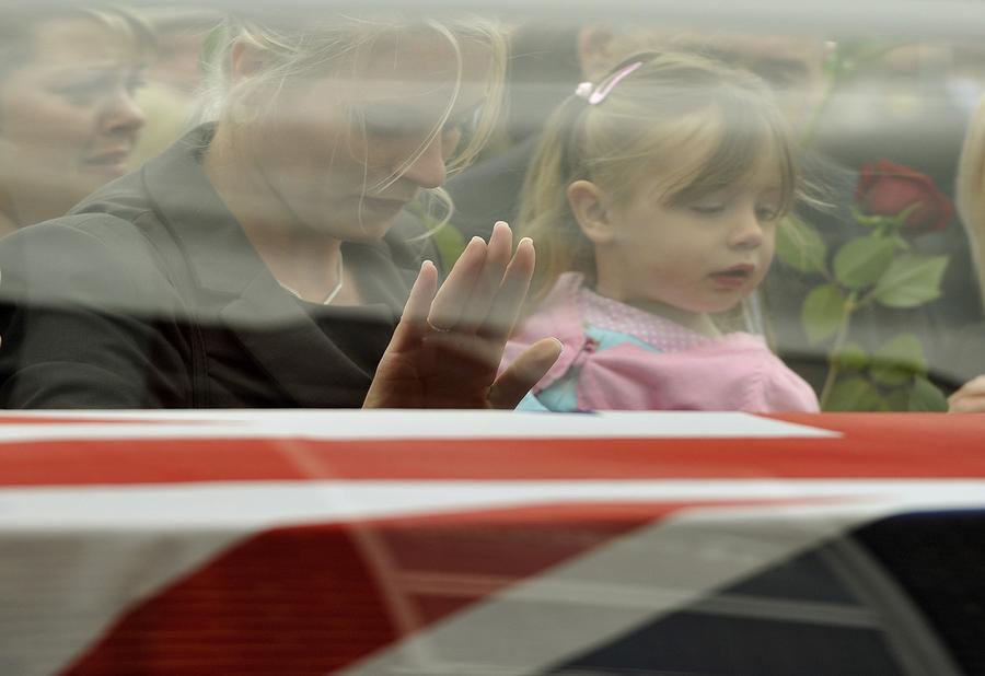 Read moreMelissa Lamb carries her two-year-old daughter Rosie as she touches the hearse carrying the coffin, of her killed husband Rifleman Martin Lamb, draped in a union flag at Wootton Bassett in Wiltshire, England, on June 9, 2011. #