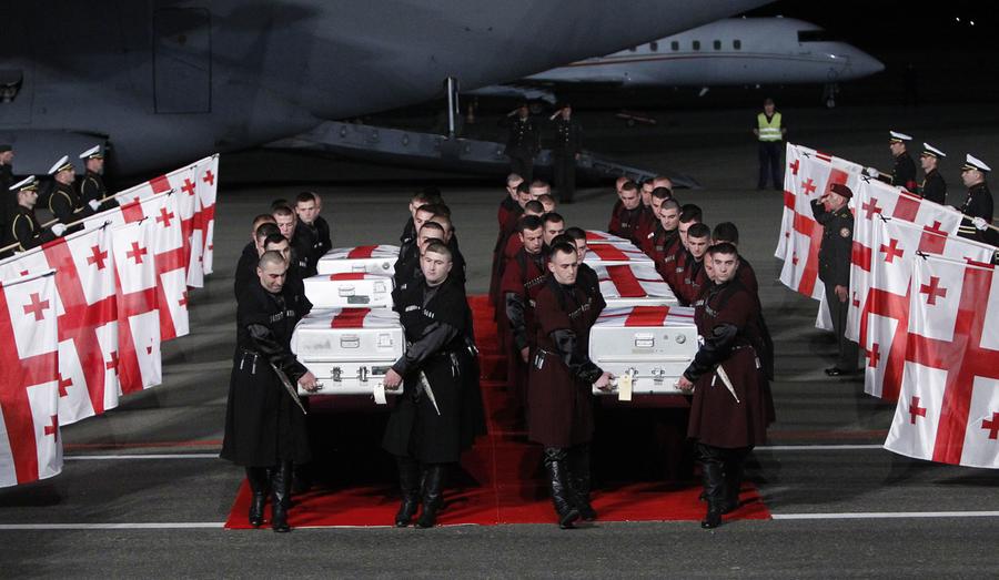 Read moreAn honor guard carries coffins of Georgian soldiers killed in Afghanistan at the airport in Tbilisi, June 9, 2013. A suicide bomber detonated a small truck loaded with explosives in southern Afghanistan, killing seven Georgian soldiers, NATO and Georgian officials said, and the Afghan Taliban claimed responsibility. #