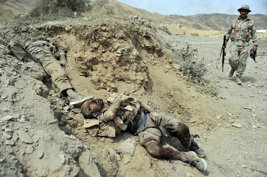 Click to view imageRead moreAfghan security personnel walk near bodies of Taliban fighters after a firefight in Torkham, on September 2, 2013. A group of Taliban suicide bombers and gunmen attacked a US base near the Pakistani border in eastern Afghanistan, sparking a three-hour shootout, officials said. No member of the US-led NATO mission in Afghanistan was killed in the attack, said a spokesman for the International Security Assistance Force (ISAF). #