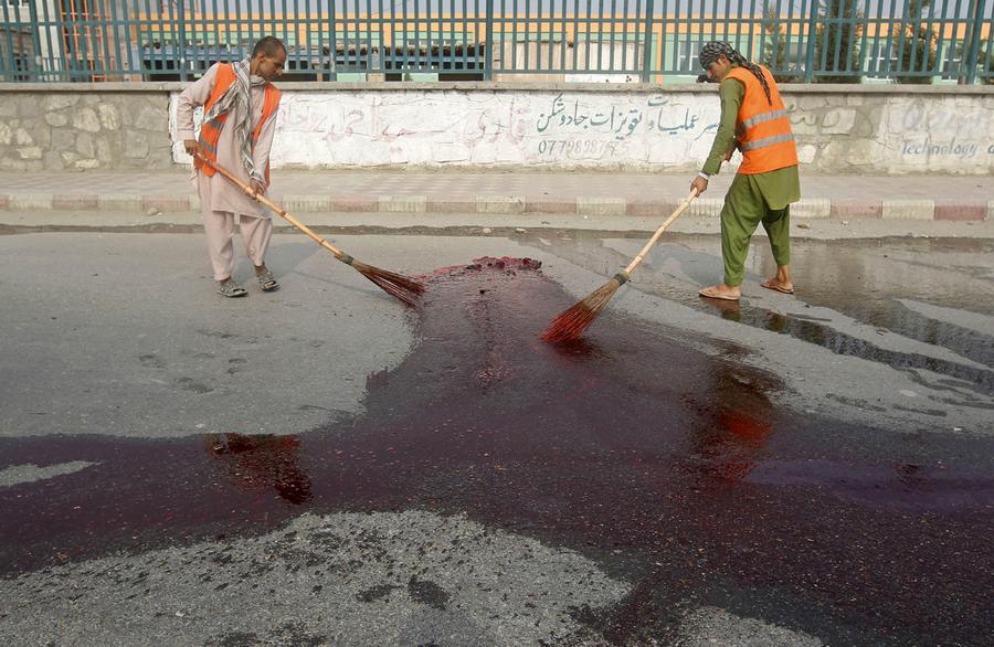 Read moreAfghan municipality workers remove blood from a site of an explosion in Jalalabad province, on July 16, 2013. A bomb planted on a bicycle detonated killing at least two people and injuring three others, a police officer said. #