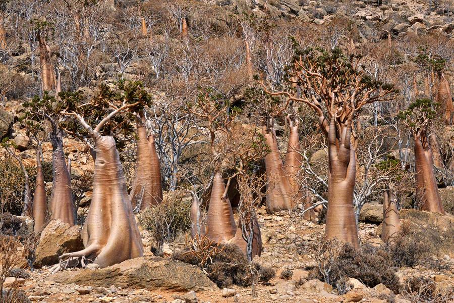 Read moreDragon Blood trees and Socotran "desert roses" (Adenium obesum, subspecies socotranum), on a hillside in the protected area of Homhill on Socotra Island, on February 1, 2008. #