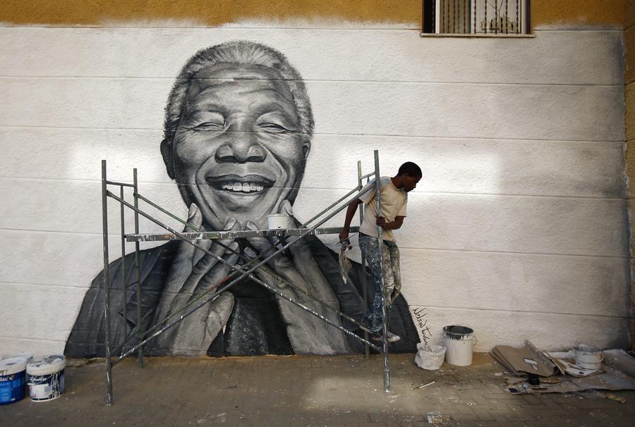 Read moreNelson Tavares, 24, works on a mural of former South African president Nelson Mandela which he painted during festivities in his neighborhood in Lisbon, Portugal, on June 20, 2013. #