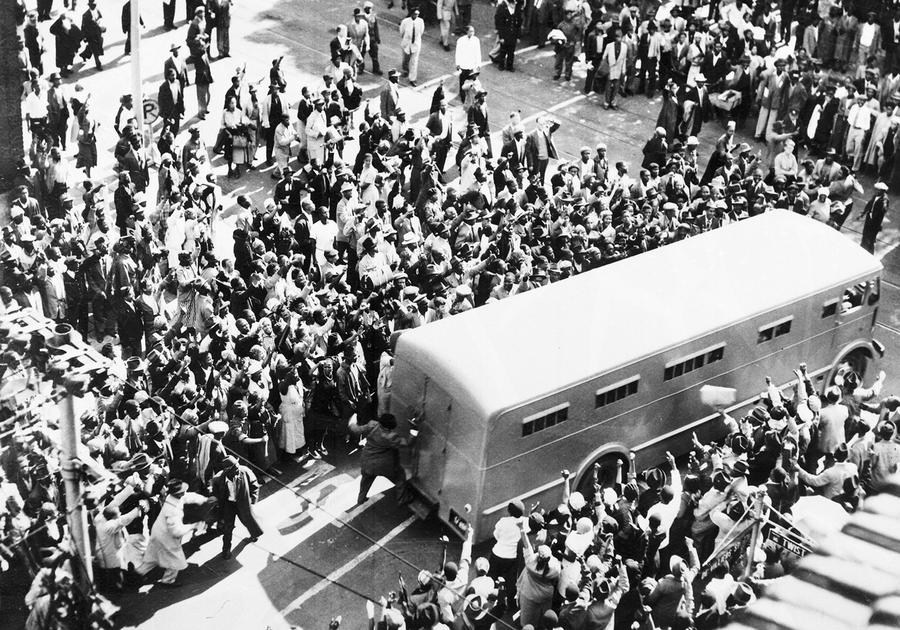 Read moreCrowds cheer as a police van brings prisoners to the Drill Hall, in Johannesburg, South Africa, December 31, 1956, for the start of the "Treason Trial." One man has climbed onto the step of the van top shout encouragement to the inmates. Nelson Mandela was among the people arrested and standing trial. Mandela was banned from public speaking, arrested and jailed multiple times throughout the 1950s. #