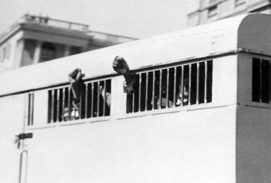 Read moreEight men, among them anti-apartheid leader and member of the African National Congress (ANC) Nelson Mandela, sentenced to life imprisonment in the Rivonia trial leave the Palace of Justice in Pretoria, on June 16, 1964 with their fists raised in defiance through the barred windows of the prison car. The eight men were accused of conspiracy, sabotage and treason. #