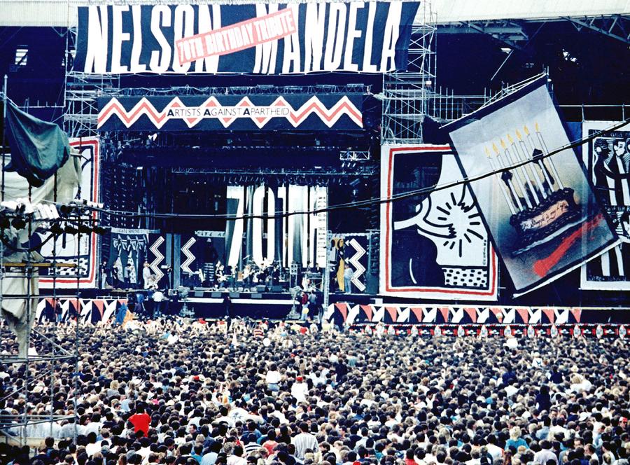Read moreThe stage at Wembley Stadium, London, on June 11, 1988, during a performance by the band Eurythmics at the benefit concert for Nelson Mandela. The 10-hour-long concert "Nelson Mandela, Freedom at 70" was watched by 70,000 fans in the stadium and was televised to 60 countries worldwide. #