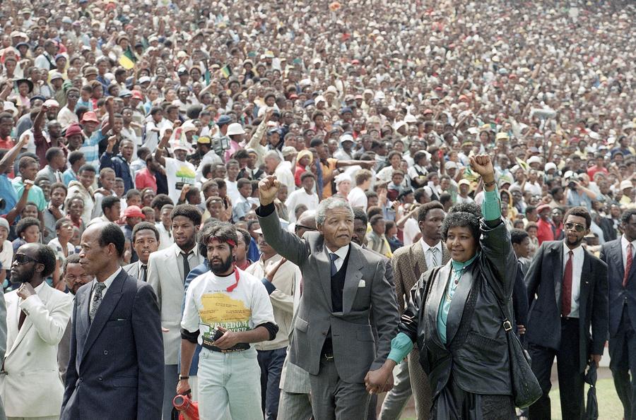 Read moreNewly-free Nelson Mandela and Winnie Mandela salute as they enter Soweto's Soccer City stadium, in South Africa, on February 13, 1990. 120,000 thousand people packed the venue to hear his speech. #