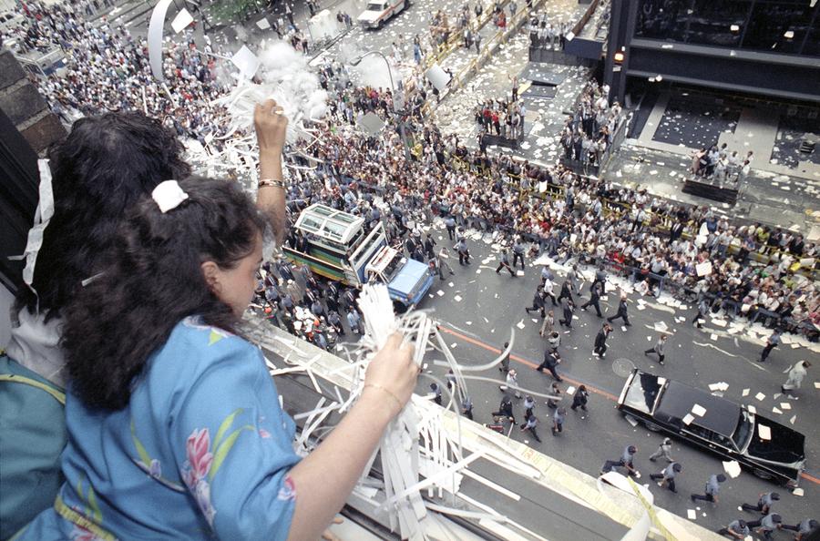 Read moreSouth African leader of the ANC, Nelson Mandela raises his fist after addressing a crowd of about 15,000 people from the balcony of the city theater in Amsterdam, on June 16, 1990. #
