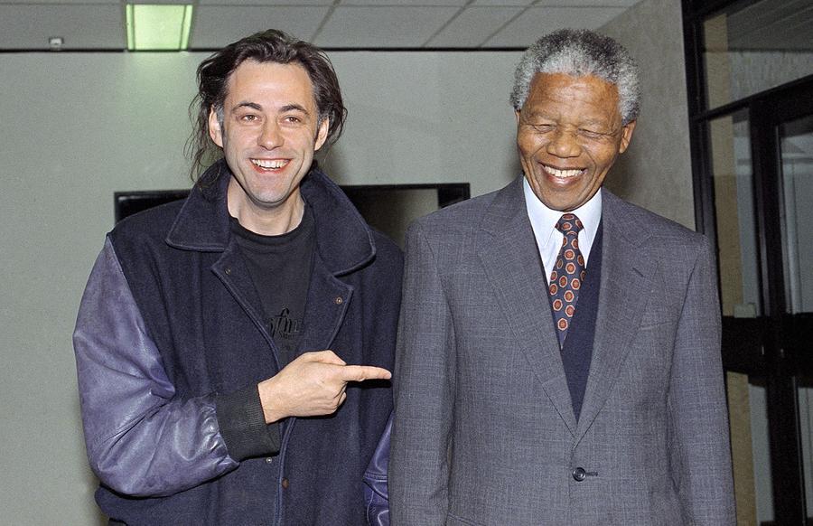 Read moreRock star Bob Geldof shares a joke with African National Congress President Nelson Mandela during a visit in Johannesburg, on July 15, 1991. Geldof, the originator of the Live-Aid benefit rock concert, was on a four day visit to South Africa. #