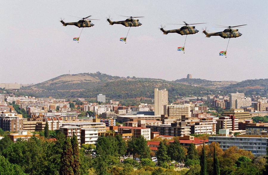 Read moreSouth African Defense Force helicopters carrying the new South African flag fly over Pretoria during the inauguration ceremony for the country's first black president, Nelson Mandela in Pretoria, South Africa, on May 10, 1994. The inauguration finished with a thunderous cannon salute, warplanes trailing smoke in the national colors of red, white, blue, black, green and gold, and these helicopters carrying the redesigned flag. #