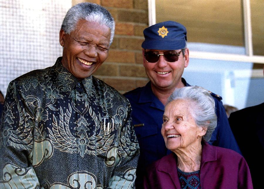 Read morePresident Nelson Mandela and Betsie Verwoerd, widow of the assassinated architect of the failed policy of apartheid, prime minister Hendrik Verwoerd, talk to reporters August 15 after meeting over coffee and cakes in Orania, a whites-only enclave near Kimberley, on August 15, 1995. #