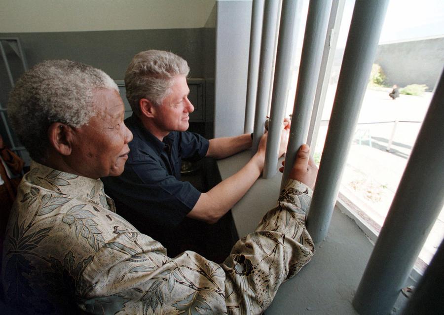 Read moreSouth African President Nelson Mandela and U.S. President Bill Clinton look out through the bars of cell number 5 where Mandela was imprisoned for 18 years on Robben Island, on March 27, 1998. Clinton said he was glad Mandela survived the experience without "having his heart turned into stone." #