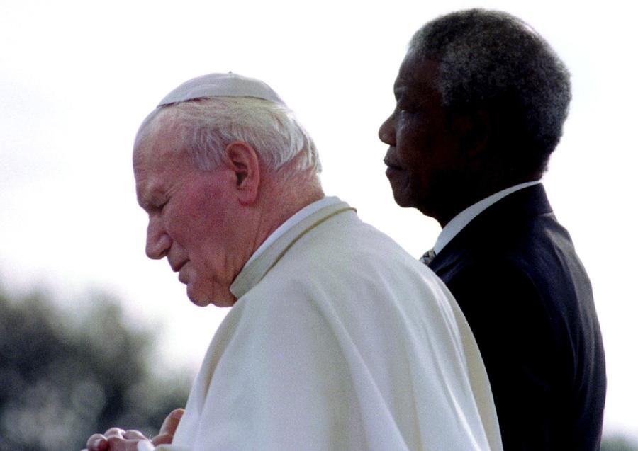 Read moreSouth African President Nelson Mandela (R) and Pope John Paul II listen to national anthems after they met at Johannesburg International Airport, at the start of the pope's first official visit to the country, on September 16, 1995. #