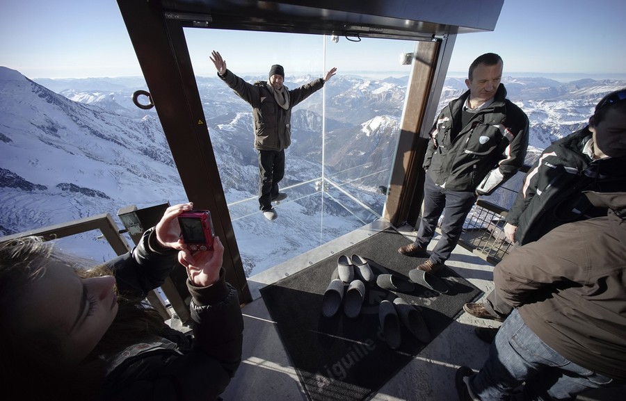Read moreA journalist, wearing slippers to protect the glass floor, stands in the "Step into the Void" installation during a press visit at the Aiguille du Midi mountain peak above Chamonix, in the French Alps, on December 17, 2013. The Chamonix Skywalk is a five-sided glass structure installed on the top terrace of the Aiguille du Midi (3842m), with a 1,000 meter drop below, where visitors can step out from the terrace, giving the visitors the impression of standing in the void. The glass room will open to the public on December 21, 2013. #