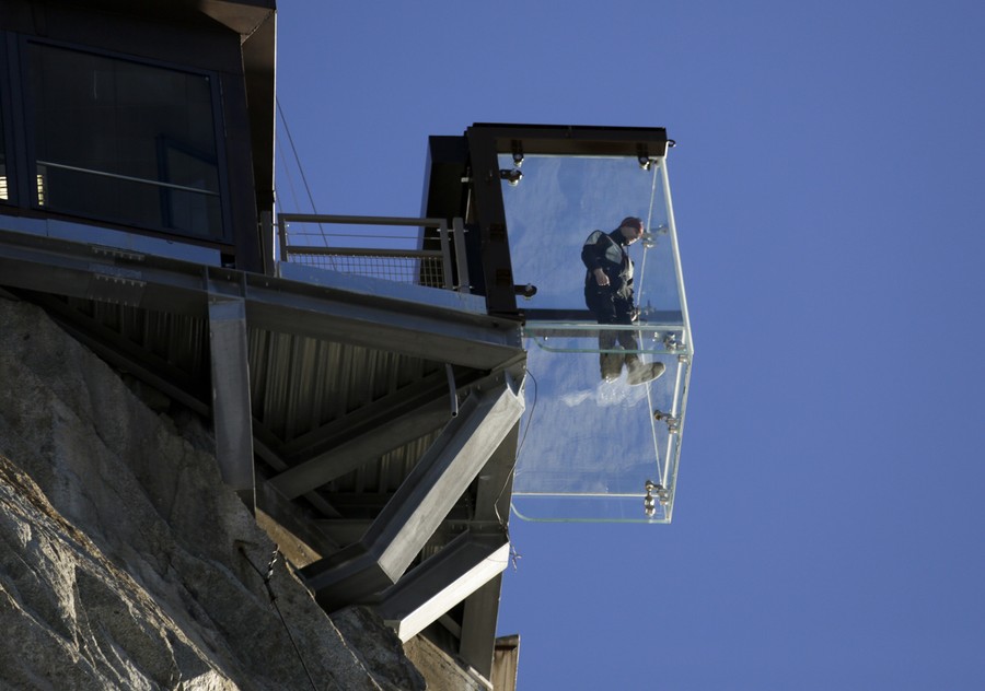 High up in the French Alps, on the top terrace of the Aiguille du Midi mountain peak, sits a new five-sided glass structure called the Chamonix Skywalk. The installation was inspired by the Grand Canyon's glass skywalk, but it takes the concept to the next level. Instead of looking out over a railing, visitors can hover 1,035 meters (3,396 feet) above the valley in an enclosed transparent box, surrounded on all sides by custom-made 12 mm (1/2 inch) glass. The skywalk will open to the public on December 21, 2013.