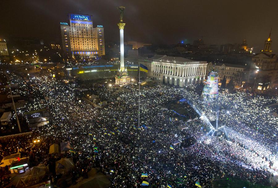 Read morePro-European Union activists hold lights while singing the Ukrainian national anthem as they celebrate the New Year in Kiev's main square early on January 1, 2014, in Ukraine. At least 100,000 Ukrainians sang the country's national anthem together at the square on New Year's Eve in a sign of support for integration with Europe. Opposition leaders had called on Ukrainians to come to the Maidan on New Year's Eve and sing the national anthem in an act of defiance and what they expected could be the record-breaking live singing of an anthem. #