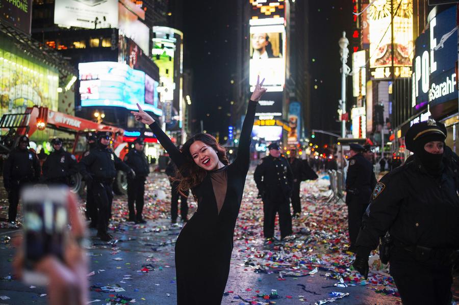 Read moreDiana Vy of Philadelphia strikes a pose as she is photographed by friends amid police and confetti after New Year celebrations in Times Square, Midtown, New York, on January 1, 2014. #