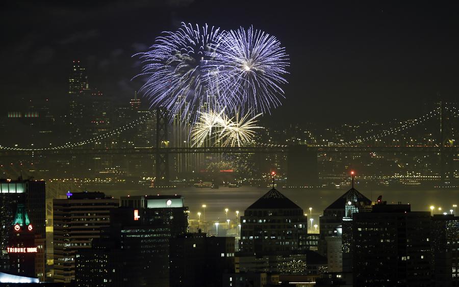 Read moreFireworks fill the air in the bay over the Oakland and San Francisco skylines, divided by the San Francisco Oakland Bay Bridge, as part of New Year's Eve celebrations in a view from Oakland, California, on January 1, 2014. #