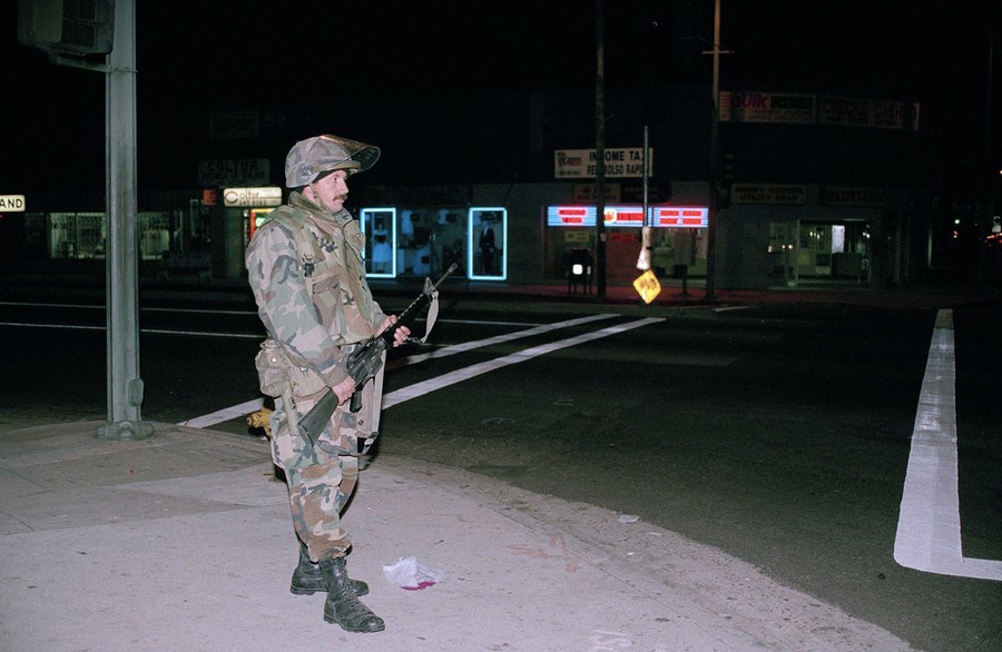 Read moreCalifornia National Guardsman Sgt. David Valenzuela, stands guard over the corner of Sherman Way and Reseda in the San Fernando Valley area of Los Angeles in the early morning of January 18, 1994. #