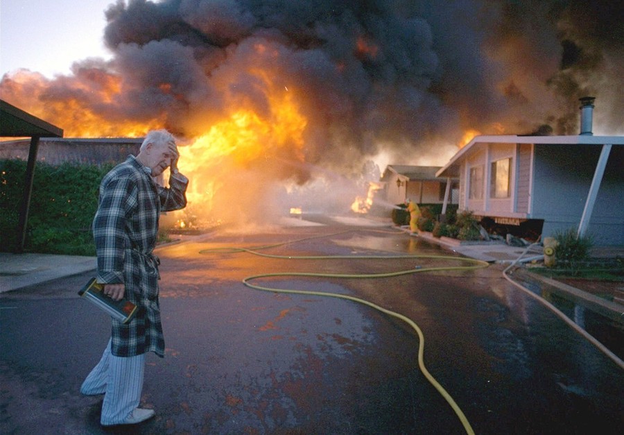 Read moreSpectators watch a building burn amid glass shards and other rubble in the Sherman Oaks area of Los Angeles in the early morning hours of January 17, 1994, following a major earthquake that hit Los Angeles. #