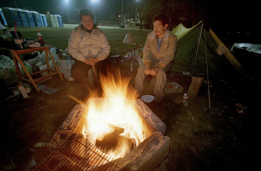 Read moreImuez Rodrigues, left, and Jose Murillo, homeless following Monday's deadly earthquake, huddle around a warm fire at their camp in the Granada Hills area of Los Angeles, on January 19, 1994. #
