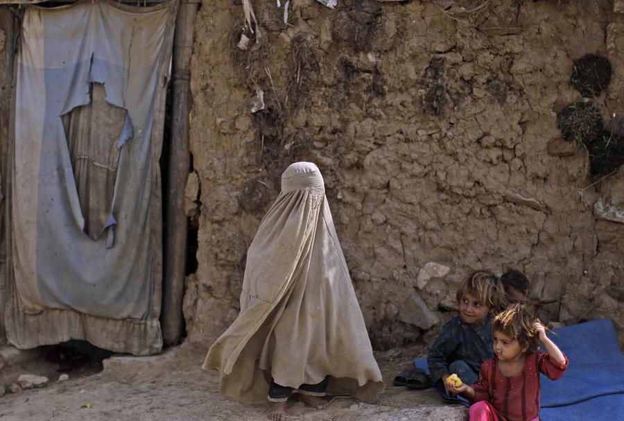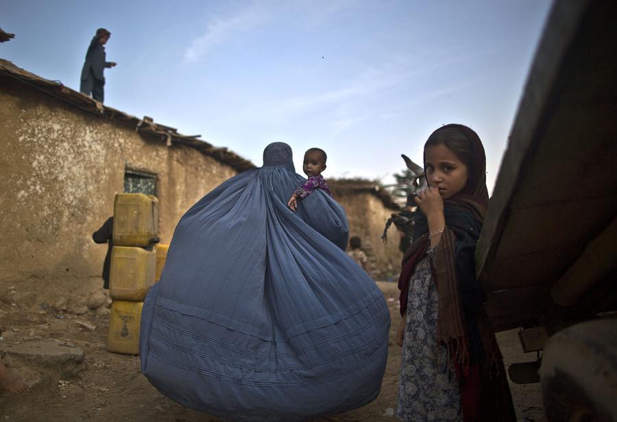 Read moreAn Afghan refugee, her burka billowing, holds her daughter as she walks to her home through an alley of a poor neighborhood on the outskirts of Islamabad, on September 16, 2013. #