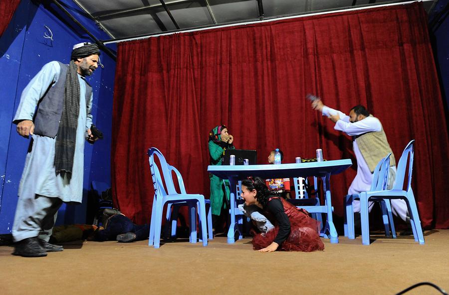 Read moreAfghan stage actors re-create the attack on Afghan AFP reporter Sardar Ahmad and his family, and their tragic death, in a stage performance in Herat province on April 10, 2014. Sardar, his wife and two of their children were killed in a Taliban attack, as four teenage gunmen with concealed pistols carried out a raid on the prestigious Serena hotel just weeks before the election. Sardar Ahmad, 40, his wife Homaira, six-year-old daughter Nilofar and five-year-old son Omar were among nine civilians to have lost their lives in the assault. #