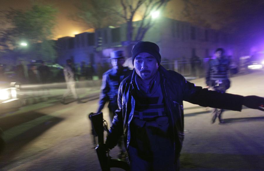 Read moreAn Afghan police officer rushes to the scene where a rocket hit outside the luxury Serena Hotel in Kabul on November 21, 2009. At least two people were injured, the Afghan Interior Ministry said. #