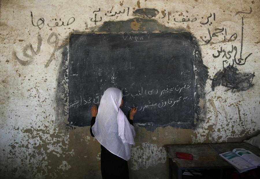 Read moreAn Afghan girl writes on a board in front her class at the girls high school Ayeshe Sedeqa in the center of Kunduz, northern Afghanistan, on September 21, 2008. The Afghan government alleges the Taliban tried to poison students at girls' schools, causing outbreaks of sickness, and says 15 suspects were arrested. #