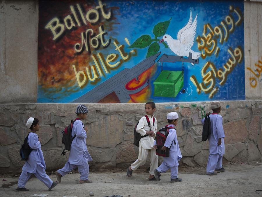 Read moreSchool children pass by a painted sign reading, "ballot not bullet" on their way back home on the outskirts of Kandahar, on March 12, 2014. Warlords with a violent past have played a role in influencing Afghan politics since a U.S.-led coalition helped oust the Taliban in 2001. But they are emerging to play an overt political role in next month's presidential elections as President Hamid Karzai leaves the scene. #