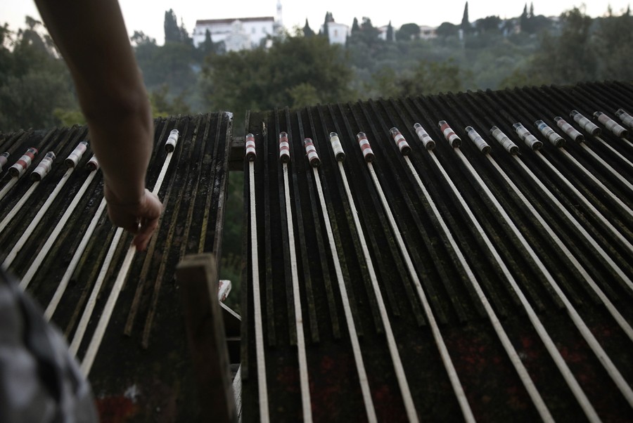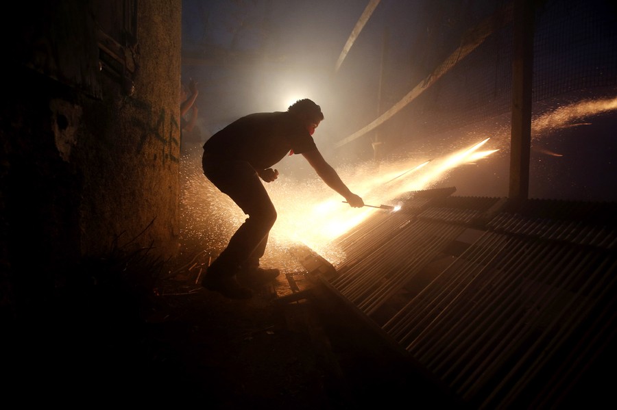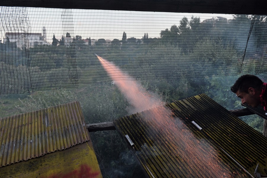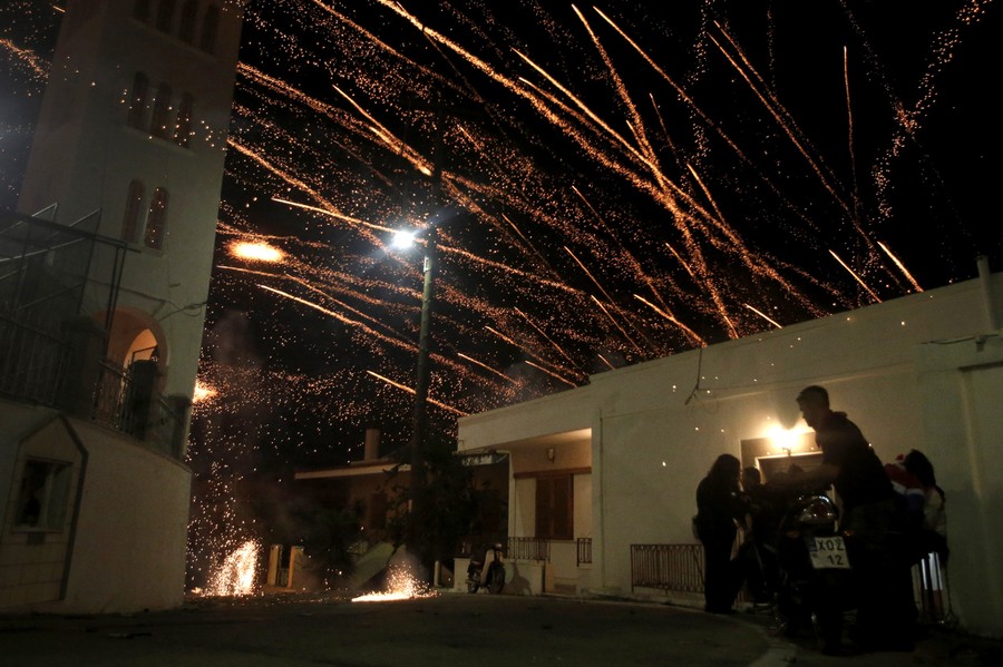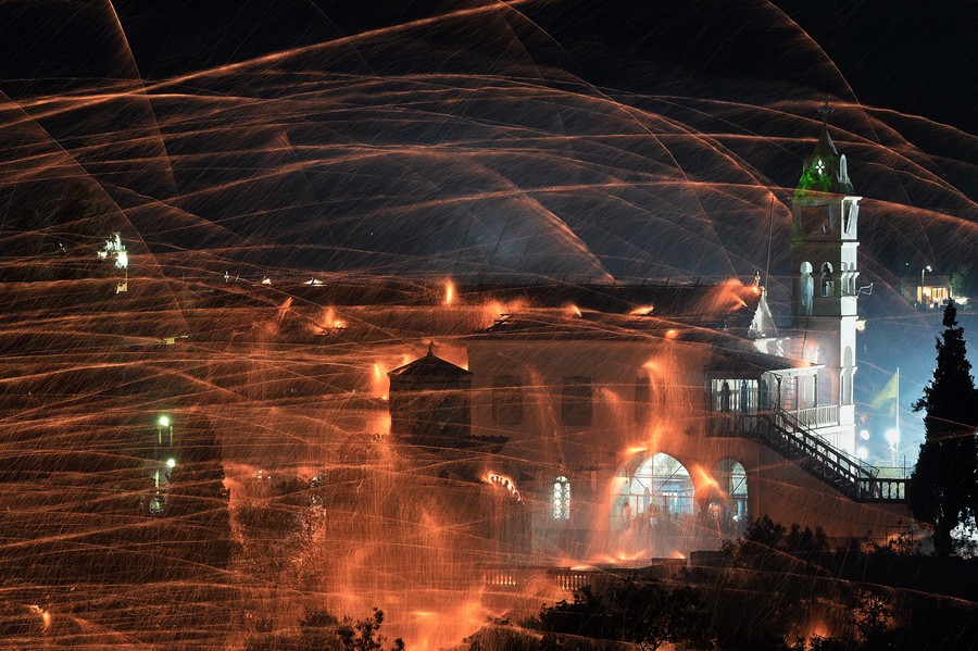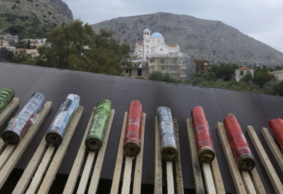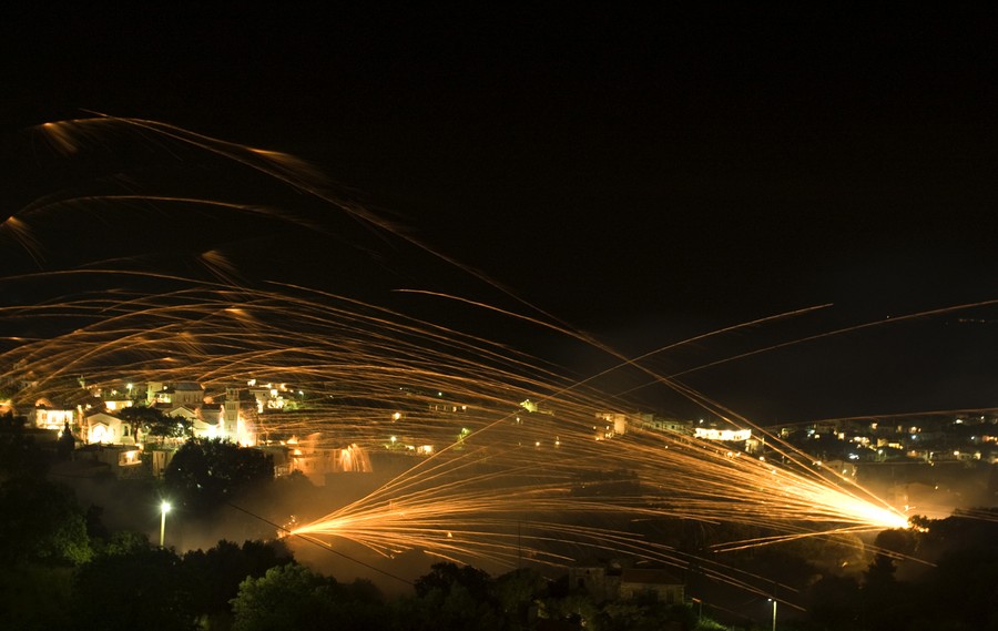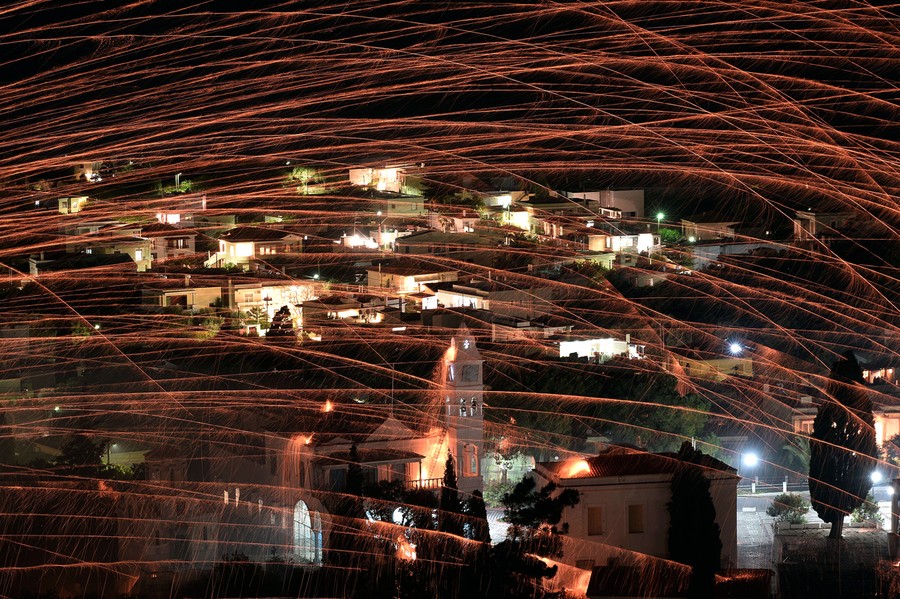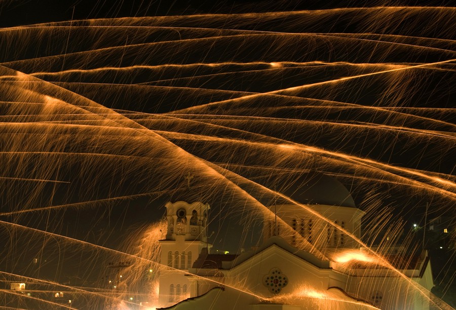 Every Easter, in the Greek village of Vrontados, members of rival churches sitting across a small valley stage a "rocket war" by firing thousands of homemade rockets towards each other while services are held. The objective for each side is to strike the bell of the opposing church. The festival, called Rouketopolemos, has been celebrated by the churches of Agios Markos and Panagia Erithiani for at least 125 years, its exact origins a mystery. Gathered here are images of this rocket war from the past few years.