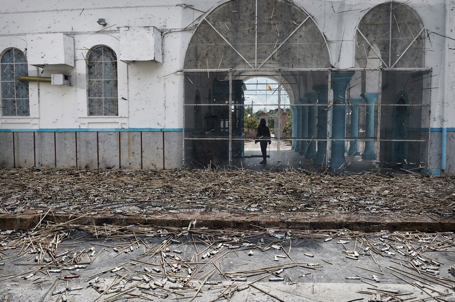 Read moreA woman walks near scores of burned-out homemade rockets on the ground, and stuck in a protective metal fence at Panagia Erithiani church, following a traditional Easter celebration the night before in Vrontados, on April 20, 2014. #