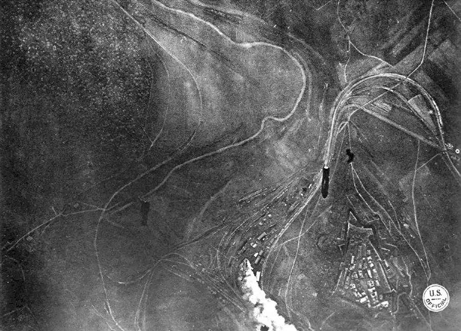 Read moreBombing Montmedy, 42 km north of Verdun, while American troops advance in the Meuse-Argonne sector. Three bombs have been released by a U.S. bomber, one striking a supply station, the other two in mid-air, visible on their way down. Black puffs of smoke indicate anti-aircraft fire. To the right (west), a building with a Red Cross symbol can be seen. View this point today on Google Maps. #