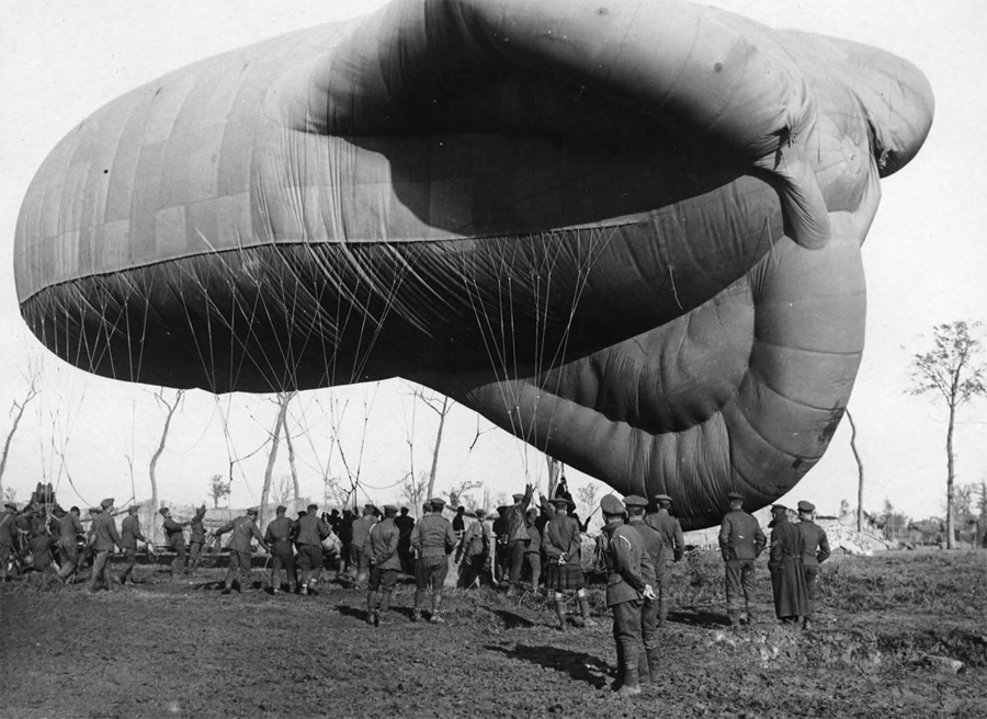 Read moreA returning observation balloon. A small army of men, dwarfed by the balloon, are controlling its descent with a multitude of ropes. The basket attached to the balloon, with space for two people, can be seen sitting on the ground. Frequently a target for gunfire, those conducting observations in these balloons were required to wear parachutes for a swift descent if necessary. #