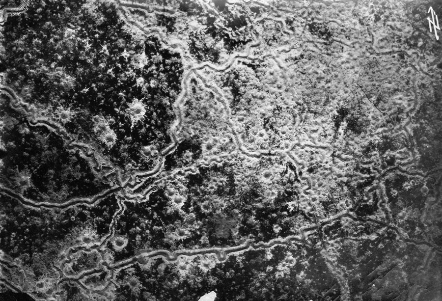 Read moreAerial reconnaissance photograph showing a landscape scarred by trench lines and artillery craters. Photograph by pilot Richard Scholl and his co-pilot Lieutenant Anderer near Guignicourt, northern France, August 8, 1918. One month later, Richard Scholl was reported missing. #