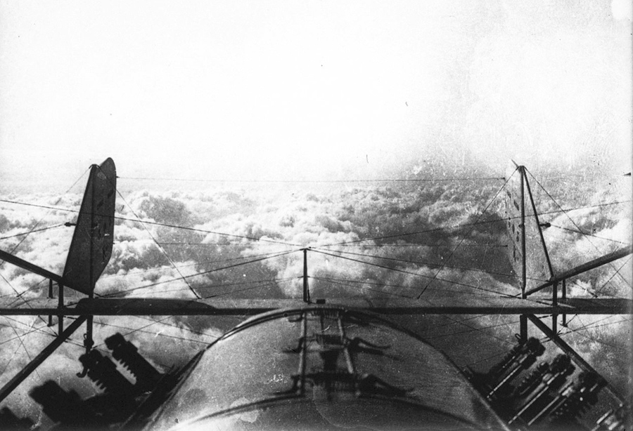 Read moreBritish Handley-Page bombers on a mission, Western Front, during World War I. This photograph, which appears to have been taken from the cabin of a Handley-Page bomber, is attributed to Tom Aitken. It shows another Handley-Page bomber setting out on a bombing mission. The model 0/400 bomber, which was introduced in 1918, could carry 2,000 lbs (907 kilos) of bombs and could be fitted with four Lewis machine-guns. #