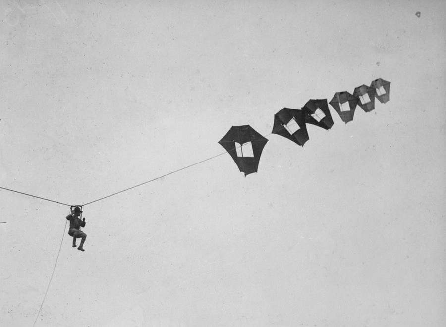 Read moreLieutenant Kirk Booth of the U.S. Signal Corps being lifted skyward by the giant Perkins man-carrying kite at Camp Devens, Ayer, Massachusetts. While the United States never used these kites during the war, the German and French armies put some to use on the front lines. #