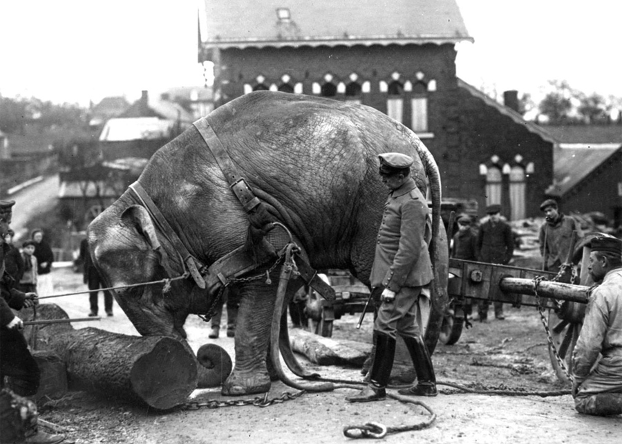 Read moreAn Indian elephant, from the Hamburg Zoo, used by Germans in Valenciennes, France to help move tree trunks in 1915. As the war dragged on, beasts of burden became scarce in Germany, and some circus and zoo animals were requisitioned for army use. #