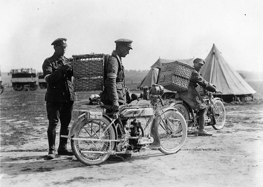 Read moreTwo soldiers with motorbikes, each with a wicker basket strapped to his back. A third man is putting a pigeon in one of the baskets. In the background there are two mobile pigeon lofts and a number of tents. The soldier in the middle has the grenade badge of the Royal Engineers over the chevrons which show he is a sergeant. #