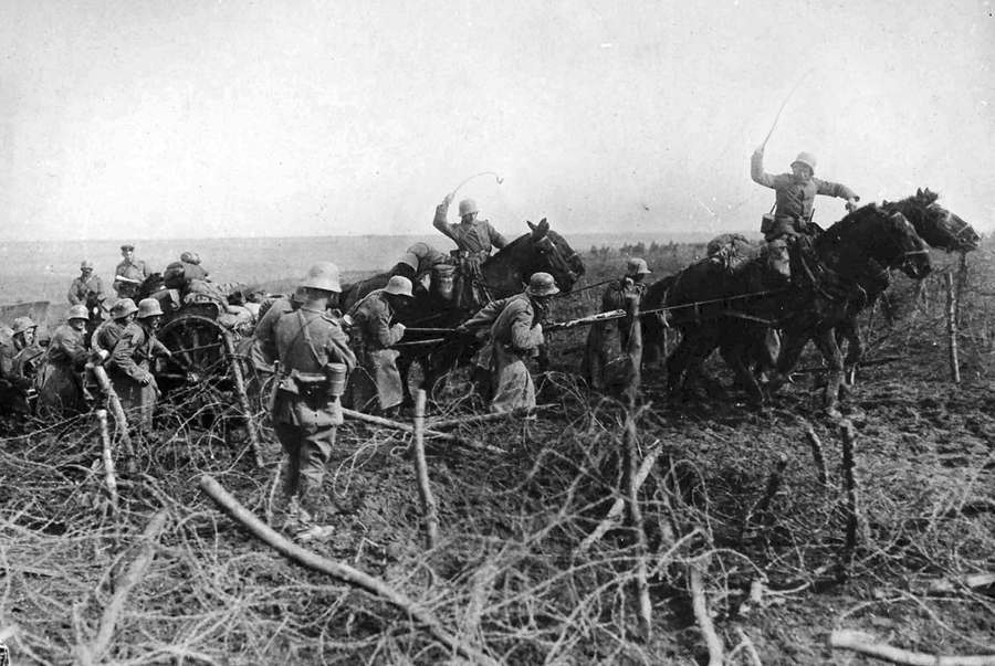 Read moreGerman soldiers pose near a horse mounted with a purpose-built frame, used to accommodate a captured Russian Maxim M1910 machine gun complete with its wheeled mount and ammunition box. #