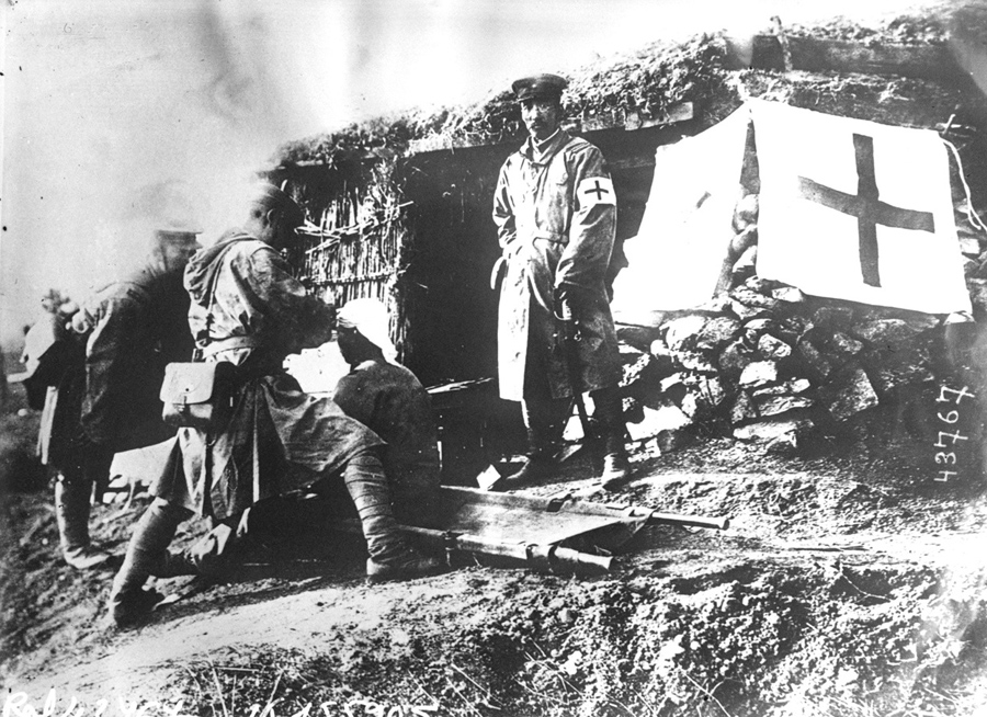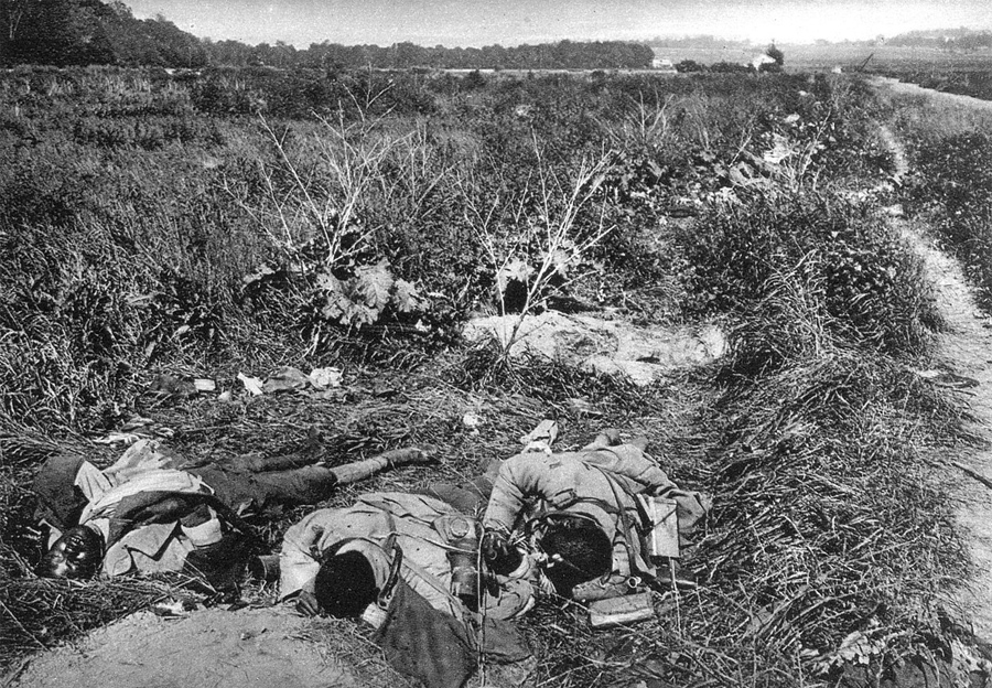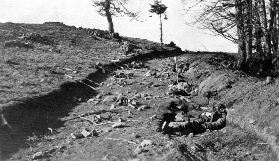 Read moreAn Eastern Front battlefield, littered with the bodies of soldiers (possibly Russian or Serbian), killed in their shallow shell-scrapes. Each man has had his personal equipment removed and his M.91 Mosin-Nagant thrown to the side by advancing Central Powers troops. #