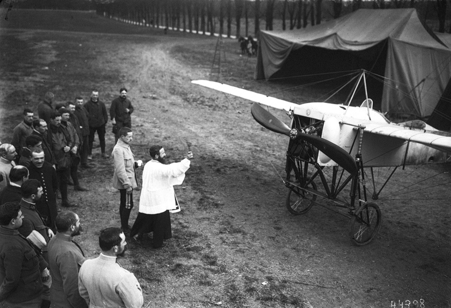 Read moreThe conflict, called the Great War by those involved, was the first large-scale example of modern warfare - technologies still use in battle today were introduced in large scale forms then, some (like chemical attacks) were outlawed and later viewed as war crimes. The newly-invented aeroplane took its place as an observation platform, a bomber, and an anti-personnel weapon, even as an anti-aircraft defense, shooting down enemy aircraft. Here, French soldiers gather around a priest as he blesses an aircraft on the Western Front, in 1915. #