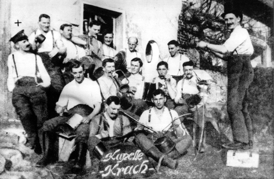 Read moreUndated image, reportedly of Corporal Adolf Hitler of the German Army, standing at left (under the "+") with his comrades forming the band "Kapelle Krach", during recovery from an injury he received on the western front during World War I. #