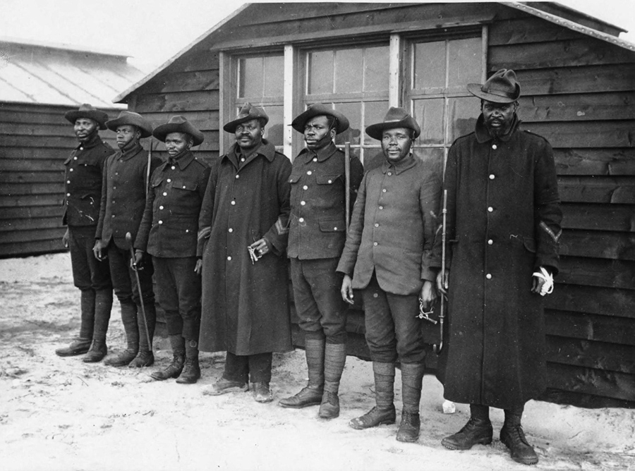 Read moreLabour Corps members, the caption identifies these seven men as 'native police'. They are probably black South Africans who had contracted to work in the South African Native Labour Contingent (SANLC). In general the native police and NCOs were recruited from tribal chiefs or high-status native families. Some 20,000 South Africans worked in the SANLC during the war. They were not meant to be in combat zones, but there were inevitable deaths when the docks or transport lines on which they worked were bombed. The greatest tragedy was the sinking of the troopship SS Mendi on February 21, 1917, when 617 members of the SANLC were drowned in the English Channel. #