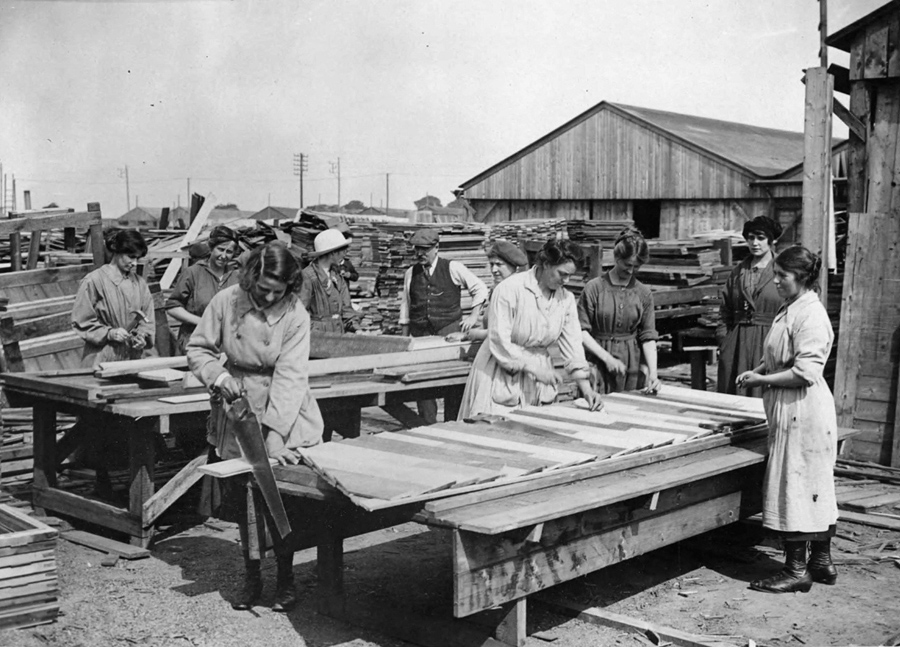 Read moreA group of female carpenters work in a lumber yard in France, constructing wooden huts. While they do not have a uniform, all the women appear to be wearing a protective coat or pinafore over their clothing. It is thought this photograph was taken by the British official photographer, John Warwick Brooke. Q.M.A.A.C. stands for Queen Mary's Army Auxiliary Corps. Formed in 1917 to replace the Women's Auxiliary Army Corp, by 1918 around 57,000 women made up the ranks of Q.M.A.A.C. #
